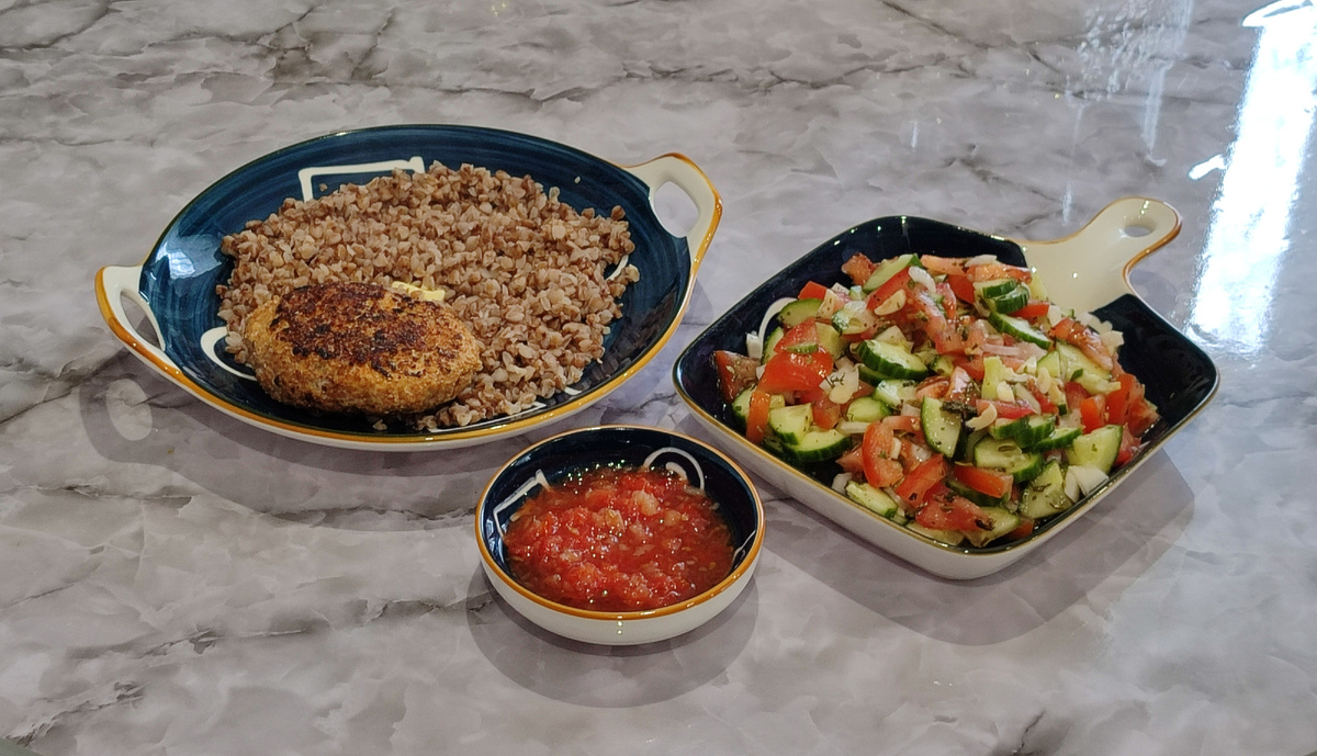 Гречка отварная (150г), со сливочным маслом (4г) и овощным салатом (230г), котлеты куриные (2шт.) с аджикой (50г)