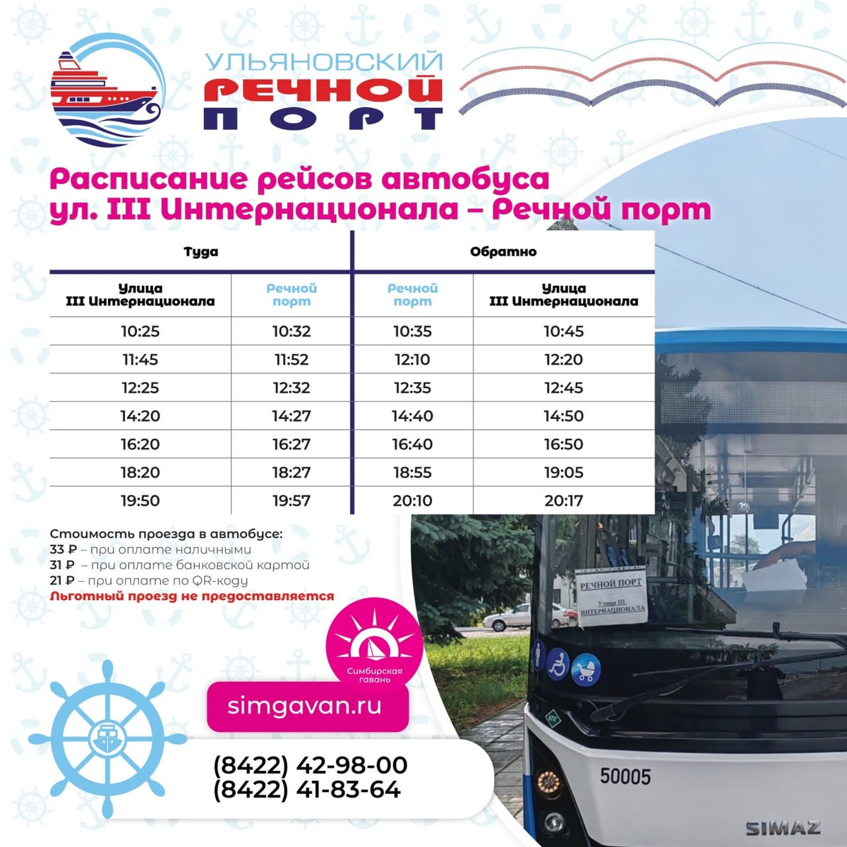 🔖В Ульяновский речной порт ходит маршрутный автобус Судоходная компания заключила договор с перевозчиком МУП «Ульяновскэлектротранс» с целью организации регулярных рейсов для доставки пассажиров в речпорт от ул. III Интернационала (от остановки общественного транспорта у якоря). Расписание рейсов привязано к графику движения теплоходов по прогулочным маршрутам. Первый рейс автобуса отправляется в порт в 10.25 и доставляет пассажиров к первой речной прогулке. Завершающий – в 19.50, обратно в 20.10. Автобус ходит ежедневно. Расписание составлено таким образом, чтобы жители и гости Ульяновска смогли добраться в речной порт и уехать обратно сразу после прогулки на теплоходе. 🔴Стоимость проезда в автобусе зависит от способа оплаты: 33 рубля – при оплате наличными; 31 рубль –при оплате банковской картой; 21 рубль – при оплате по QR-коду. Льготный проезд не предоставляется