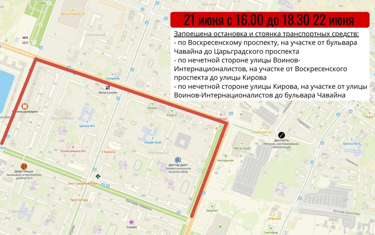 ⛔️Масштабные соревнования по триатлону пройдут в Йошкар-Оле завтра - 22 июня. В связи с этим в заречной части города на два дня перекроют несколько дорог.