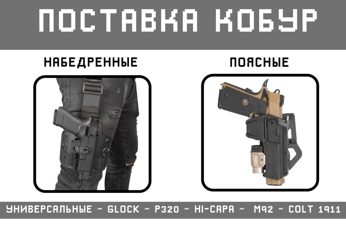 🔫 ПОСТАВКА КОБУР Широкий выбор кобур для различных моделей пистолетов, таких как Glock, Sig Sauer P320, Hi-Capa, M92, Colt 1911. Также есть универсальные варианты 😎 Вы можете подобрать кобуру с креплением на бедро или пояс — каждый найдет вариант под свои задачи. Изделия сделаны из износостойких материалов, что обеспечивает надежную фиксацию оружия. ✅ Поступили также модели Movable, которые позволяют носить в кобуре пистолет с фонарем ➡️ Каталог кобур ⬅️