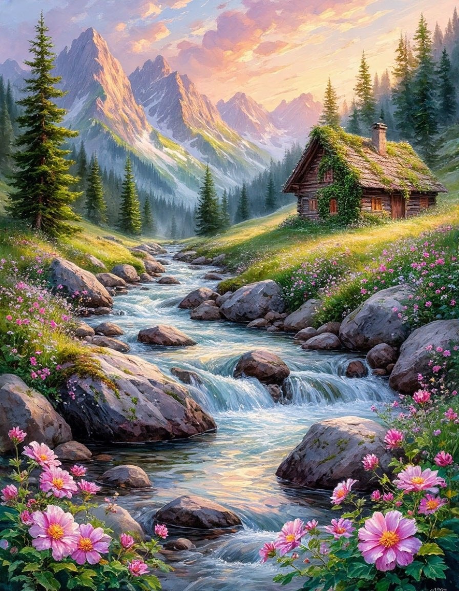 Безмятежный рассветный пейзаж со спокойной горной рекой, окруженной большими скалами и украшенной яркими альпийскими цветами, где нежные всплески воды создают ощущение умиротворения, передан мягкими, плавными мазками кисти с нежными цветовыми сочетаниями, напоминающими мечтательную акварельную картину. Вдалеке виднеется маленькая лесная покосившаяся хижина, увитая плющом. Создается впечатление, что тут долго никто не бывал.