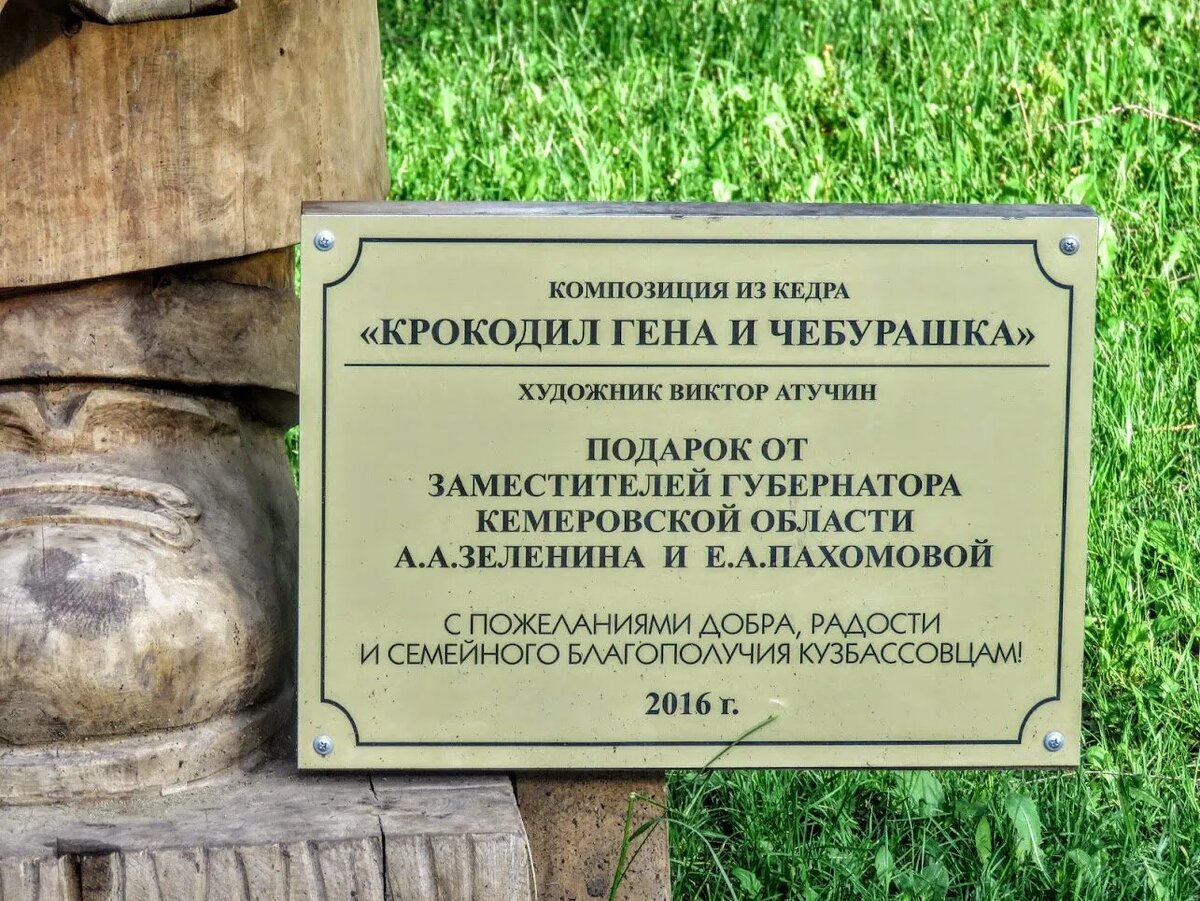 Скульптура «Крокодил Гена и Чебурашка» от Алексея Зеленина и Елены Пахомовой были возле здания администрации Ленинского района. Персонажей высотой 1,85 метра из кедра изготовил Виктор Атучин. Известные мультгерои Леопольд и мыши в ансамбле «Давайте жить дружно» заселились в Кузбасский парк. Выполненных также из кедра животных подарил Александр Данильченко Нет этих скульптурок и семья мамонтов была, тоже нет Этой клумбы тоже нет лаква есть, а столика нет канны высаживали на аллее Весенней, в 2015 г снимала этой тоже нет В 2004 году на улицах города Кемерово установили скульптуры лошади, медведя и олененка. Медведя поместили у школы № 94,что на проспекте Ленинградском, статую оленя – в сквере, на пересечении проспекта Ленина и улицы Терешковой, фигуру лошади – на бульваре Строителей. Олень, медведь и лошадь — работы неизвестного мастера. Художественные изделия были куплены за 45 тысяч рублей у базы Кемеровского ДРСУ в Березово, на складе которой они хранились несколько лет. Директор