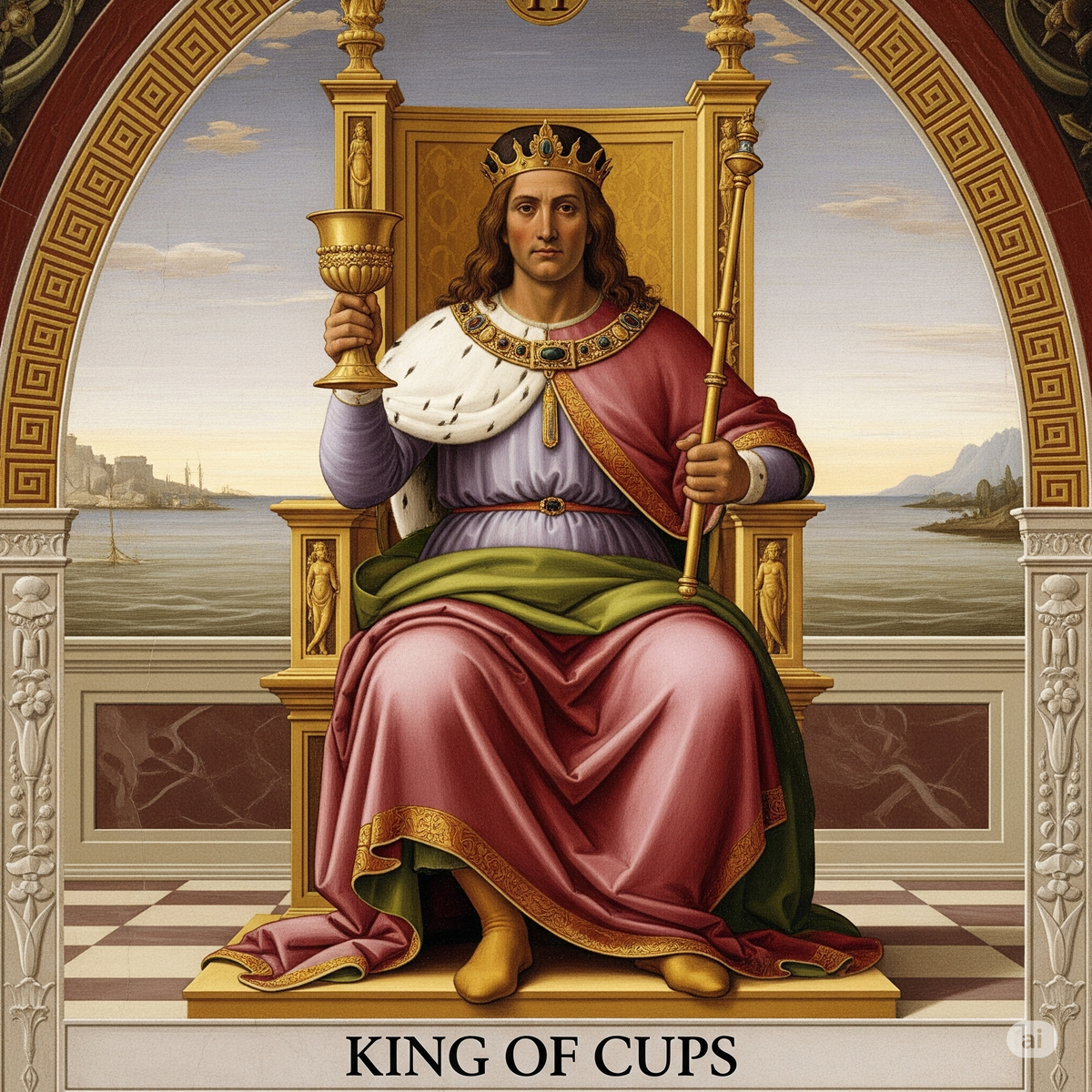 При работе с раскладами на отношения карта Таро Король Кубков представляет собой архетип эмоциональной зрелости, мудрости и глубокого понимания. Король восседает на троне, окруженный водной стихией, держа в руке кубок — символ чувств и подсознания, а в другой — скипетр, обозначающий его власть и контроль над эмоциональной сферой. Его взгляд спокоен и проницателен, что указывает на способность управлять своими эмоциями и воспринимать мир через призму сострадания.