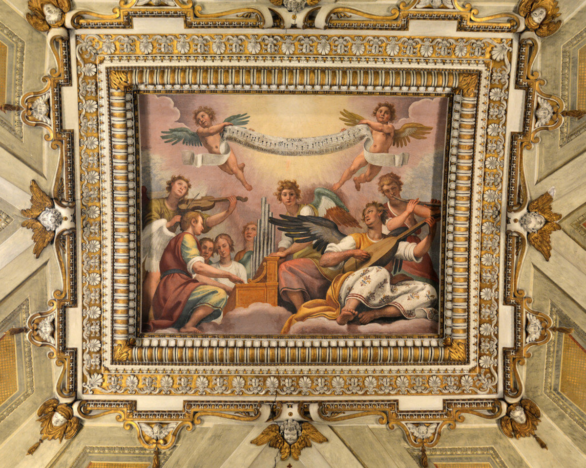 Канон, без сомнения, является символом музыкальной эпохи строго письма. Недавно я прочитал публикацию Дж. Стоессела, профессора музыкологии Австралийского университета Новой Англии о Пьетро Валентини. С огромным удивлением и удовольствием узнал об изображениях канона на фресках и картинах. Один из замечательных образцов такого канона находится на куполе Великой папской базилики Santa Maria Maggiore в Риме. Тосканский художник Доменико Крести, также известный как "Иль Пассиньяно", включил нотированный канон в оформление потолка ризницы, завершенной между 1608 и 1610 годами. Этот канон, изображенный на бандероли, которую держит пара парящих херувимов, расположен над центром ризницы, которую традиционно называют комнатой каноников. Канон на потолке не просто декоративный элемент. Он вписан в богатую символическую программу ризницы, где соседствуют тринитарный символ божественного глаза в треугольнике и богородичная иконография. Эти образы отсылают к Откровению (12:1), где Дева Мария предс