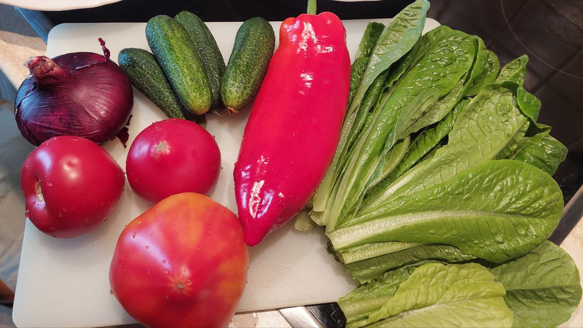 Чем хорошо лето, конечно же, помимо длинного светового дня, тепла и солнца?! Прекрасными сезонными овощами! Сегодня покажу как быстро собрать салат из привычных всем овощей и подать его красиво! Готовить будем на две персоны, поэтому в вашем холодильнике должны быть: Шаг 1. Рвем листья салата и формируем из него "подушку" на тарелке для следующих овощей Шаг 2. Сладкий перец - чистим от плодоножки, семечек и режем хаотичной соломкой, выкладываем поверх листьев салата Шаг 3. Крупно режем помидоры... вы только посмотрите какие красивые грунтовые помидоры. Тея. что желто-розовые - сорт "Медовый салют", практически нет семечек, а мякоть сладковатая. Какое разнообразие... Итак, третий слой - помидоры. Добавляем растительное масло - не больше 1 чайной ложки, перчим, солим (тут по вкусу) Шаг 4. Огурцы - чистим от шкурки и режем, выкладываем поверх помидоров Шаг 5. Половину луковицы крымского лука (он сладкий) режем и выкладываем поверх огурцов Шаг 6. Творожный сливочный сыр будет оригинальн
