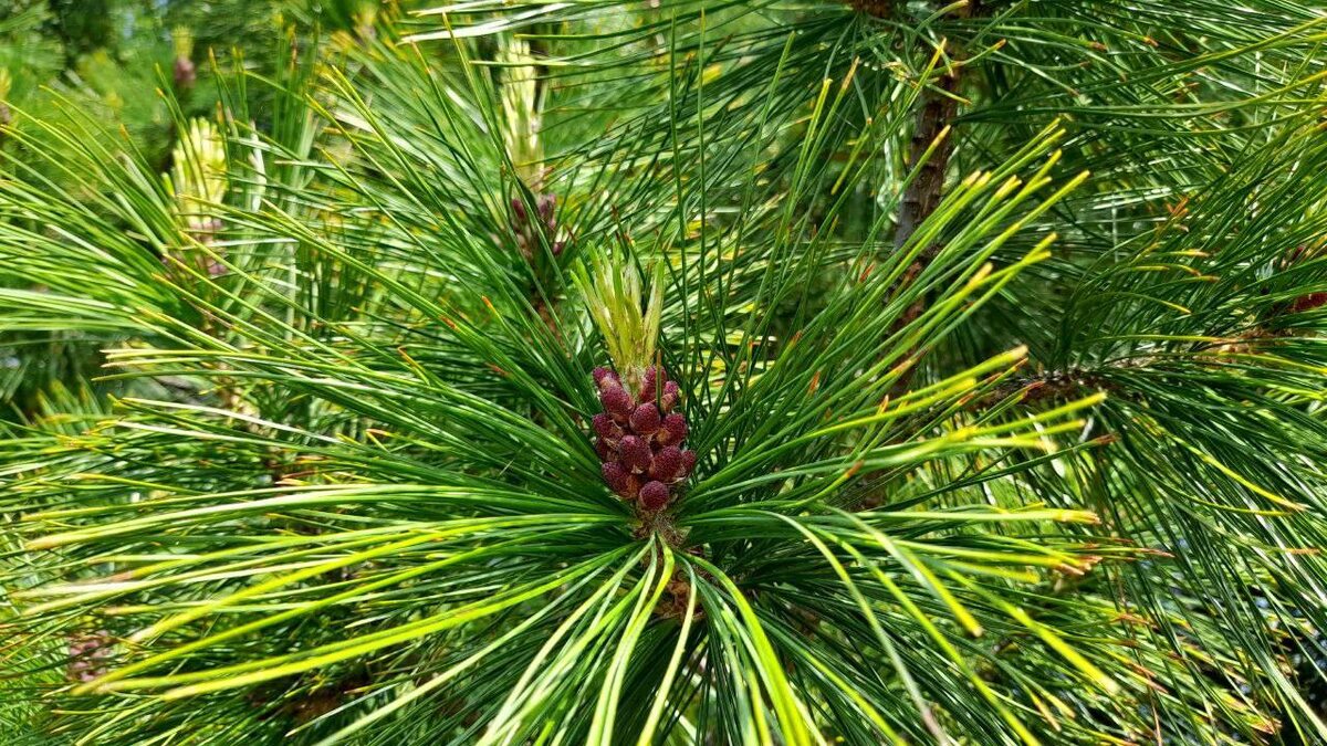 Кедры выпустили малиновые «серёжки». Это мужские соцветия, а женские шишечки скромно прячутся на верхушках.