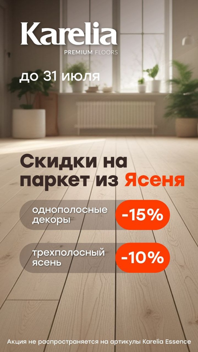 Скидки на паркетную доску из ясеня Karelia и Polarwood. На сорт Duo цена ещё ниже. Подробности по телефону