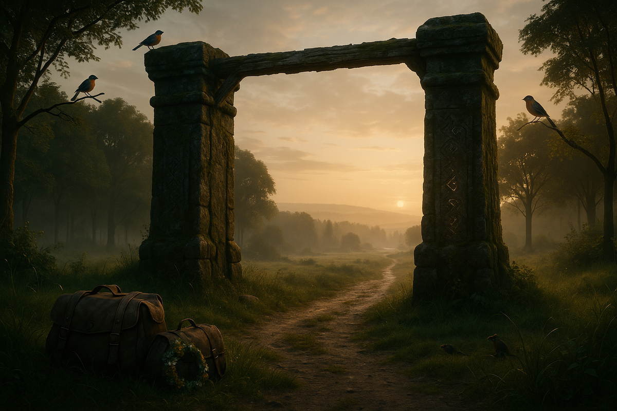 У околицы, там, где начиналась дорога на запад, высились старые ворота – два истёртых каменных столба, соединённых когда-то древесным перекрытием. Теперь от перекрытия остались лишь сгнившие обломки, но колонны стояли прочно, поросшие тёмно-зелёным мхом. Их поверхность покрывали выбитые узоры и полустёртые руны. Как и многое в Вердолине, эти ворота хранили древнюю память. Говорили, что им больше тысячи лет, и что именно через них некогда вышел из долины великий маг Эрин Луценис, отправляясь на поиски легендарного Камня Истины. Предание гласило, что на прощание Эрин благословил эти ворота, чтобы каждый, кто проходит под ними с чистым сердцем, получил невидимую поддержку великого мага.