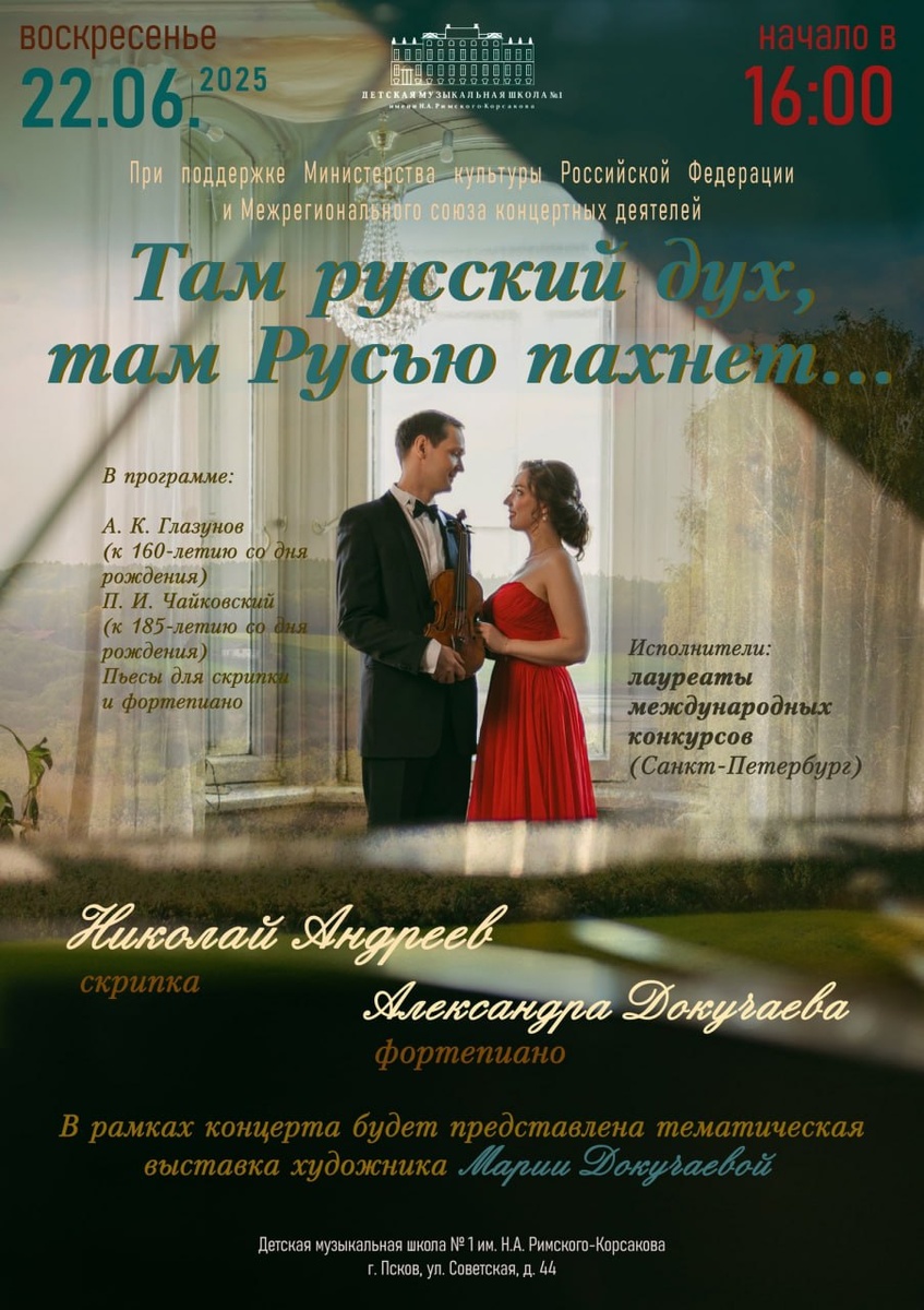 🎼В воскресенье, 22 июня в 16 часов музыканты из Санкт-Петербурга Николай Андреев (скрипка) и Александра Докучаева (фортепиано) приглашают зрителей на вечер русской классической скрипичной музыки. Об этом сообщили в областном колледже искусств. В программе А. К. Глазунов, П. И. Чайковский, пьесы для скрипки и фортепиано. "Произведения Чайковского и Глазунова позволят слушателям погрузиться в потрясающий по красоте мир русской музыки, а дополнит впечатление о непостижимой русской душе выставка текстильных платков художника Марии Докучаевой, посвященная сюжетам русских народных сказок и традиционного быта", - отметили в колледже. Концерт состоится в детской музыкальной школе №1 (Псков, ул. Советская, д. 44). Фото: Псковский областной колледж искусств