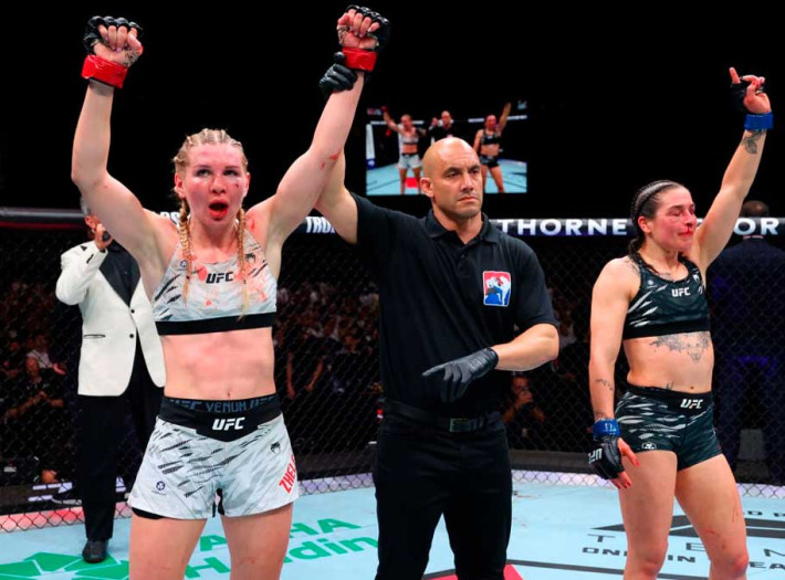 На проходящем сейчас в Баку турнире UFC Fight Night российская спортсменка Дарья Железнякова одержала победу над англичанкой Мелиссой Маллинз, взяв реванш за поражение трехлетней давности в лиге Ares FC. Поединок проходил в основном в перестрелке на дистанции, в которой Железнякова выглядела предпочтительнее и как минимум в одном из эпизодов сумела серьезно потрясти соперницу. Маллинз дважды удавалось перевести схватку в партер, но российская спортсменка в обоих случаях не позволяла ей ничего добиться в борьбе. По итогам трех раундов все судьи отдали победу Железняковой со счетом 29–28, 30–27 и 30–27.