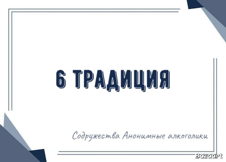 "Группе АА никогда не следует поддерживать, финансировать или предоставлять имя АА для использования какой-либо родственной организации или посторонней компании, чтобы проблемы, связанные с деньгами, собственностью и престижем не отвлекали нас от нашей главной цели." Шестая традиция Анонимных Алкоголиков гласит, что содружество не должно вмешиваться во внешние дела и не имеет мнения в вопросах за пределами сообщества. Ее основная роль — сохранять независимость и нейтральность, чтобы обеспечить безопасную и поддерживающую среду для участников, сосредоточенную исключительно на помощи в борьбе с алкоголизмом. Основная мысль этой традиции — важность личной ответственности и автономии групп, а также избегание внешнего влияния, которое могло бы разрушить единство и эффективность программы. Соблюдение шестой традиции помогает сохранить фокус на главной цели — поддержке трезвости и выздоровлении каждого участника.