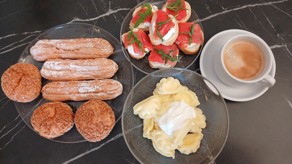 Теперь у нас в апартаментах есть своя мини-кухня, и на завтрак можно никуда не бежать, а спокойно готовить и есть, наслаждаясь чудесными видами из окна. Наш завтрак сегодня: вареники с творогом со сметаной бутерброды со скиром и копченой кетой на десерт - пирожные из пекарни Вольчека: булочки со сливками и эклеры с масляным кремом 😇 После завтрака мы прогулялись до Юсуповского дворца. У нас были билеты на самый ранний сеанс в 10 ч. А находится Юсуповский дворец в паре домов от наших апартаментов. Обедать решили пойти в Ростикс. Мне прислали баллы в подарок на день рождения, и моя еда была бесплатной. Я себе взяла две куриные ножки оригинальные Муж с сыном брали какие-то комбо с бургерами, картошкой и напитками После обеда была поездка на кораблике. Но до нее мы еще побродили по Невскому и только потом отправились на посадку. Катались почти 2 часа 👍 В ресторан мы снова не попали, но смогли заказать доставку из "Пхали-хинкали" (забирали сами в ресторане) Взяли хинкали с бараниной