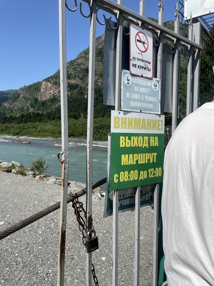 Чтобы попасть на КПП, необходимо преодолеть подвесной мост через реку Теберда. Как рекомендует табличка у входа на мост: нахождение на мосту не более пяти человек одновременно. В основном, ни у кого не возникало сложностей со счётом и все по очереди пропускали друг друга. Но иногда случались эксцессы. Когда мы втроём шли по мосту на КПП, последний стал вдруг сильно раскачиваться из стороны в сторону. Оказалось, следом за нами на мост забежал очень быстрый турист, который, по его мнению, отлично знает, что «при беге мост почти не раскачивается» (спойлер – ещё как раскачивается). Так что, когда будете идти по мосту, держитесь крепче за поручни, мало ли кто побежит вслед за вами.