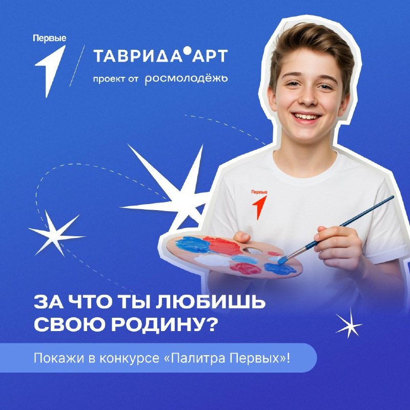 Участвуй в конкурсе Движения Первых «Палитра Первых» — покажи любовь к Родине через искусство! За что ты любишь Россию? За просторы родного края, героизм предков или семейные традиции? Расскажи об этом через творчество: 🌼 выбери номинацию — «Защитники Отечества» или «Родной край»; 🌼 создай рисунок и подай заявку до 30 июня — по ссылке. Уже в августе 1000 лучших работ будут представлены на Фестивале молодого искусства «Таврида.АРТ»! #ПалитраПервых