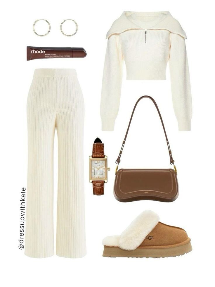 Создание гармоничного образа начинается с правильного выбора цветовой палитры. Зачастую именно сочетания цветов делают стильным и завершенным любой наряд. Но как понять, какие цвета сочетаются между собой, а какие лучше избегать? Используйте нейтральные базовые цвета. Белый, бежевый, серый, черный — отличная основа для любого образа. Они легко сочетаются с яркими и пастельными оттенками. На фото представлен стильный и уютный образ в светлых, нейтральных оттенках. Здесь доминирует кремовый и бежевый цвет — от мягких трикотажных вещей до аксессуаров. -Свитер: артикул wb 191993330 или 250750318 -Вязаные брюки: артикул wb 289385907 -Часы: артикул wb 243490378 или 227323331 -Сумка: артикул wb 424027998 -Тапочки-угги: артикул wb 180809640 -Серьги: артикул wb 191583810 Этот образ отлично демонстрирует использование светлой, нейтральной палитры — она выглядит свежо, элегантно и очень уютно. Такой стиль подходит для комфортных прогулок, отдыха или домашней обстановки, сохраняя при этом соврем