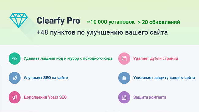 Когда начинаешь работать с сайтом на WordPress, всё кажется простым — до тех пор, пока сайт не начинает тормозить, получать странные ошибки, а SEO-продвижение будто бы не работает. Тогда наступает момент вопросов: какой плагин установить, чтобы сайт стал быстрее, безопаснее, понятнее для Google? Как не превратить панель администратора в сборище несовместимых плагинов? 💡 Решение — Clearfy Pro. Это плагин «всё в одном», который заменяет сразу несколько SEO, speed и security-плагинов. Его ставят, чтобы избавиться от мусора в коде, отключить лишние функции, ускорить сайт, усилить безопасность и улучшить SEO без программирования. ✅ Удаляет мусор из кода WordPress: ✅ Ускоряет загрузку сайта: ✅ Оптимизирует SEO: ✅ Повышает безопасность: ✅ Делает админку легче: ✅ Это позволяет не устанавливать 5–8 отдельных плагинов, а использовать только один — надёжный и совместимый. Clearfy — это не только про мощные функции, но и про удобство. Все настройки разбиты на модули. Есть описания к каждому пункт
