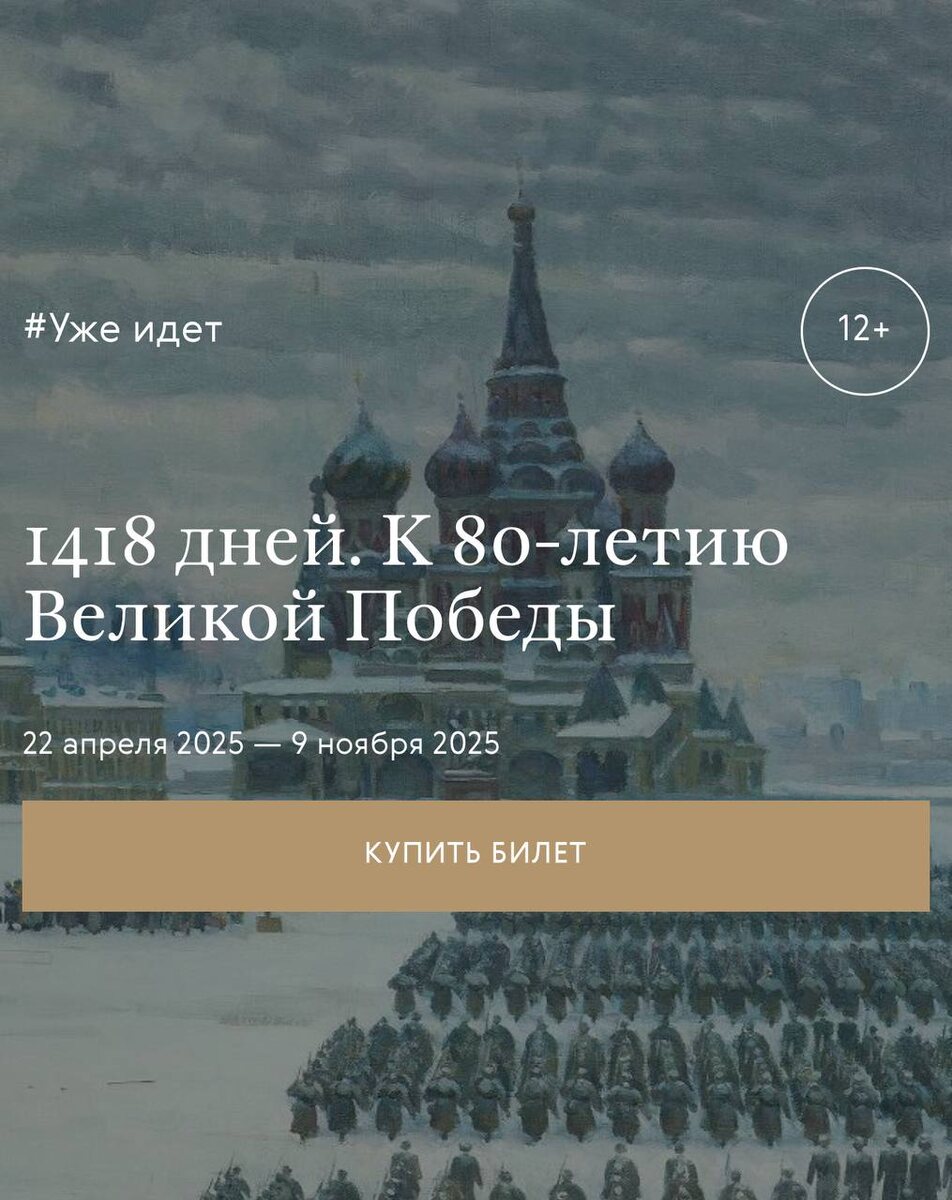 🆓Бесплатно в Третьяковскую галерею на выставку "1418 дней. К 80-летию Великой Победы" 🗓️22 июня Куратор проекта Ирина Седова называет его «выставка-переживание», позволяющая зрителям всех поколений понять и почувствовать события 1941–1945 годов через работы художников из коллекции Галереи. В экспозицию включены пять разделов – «Огненные версты войны», «Алтарь Победы», «Эхо прошедшей войны», «Лица Победы» и «Третьяковская галерея в годы Великой Отечественной войны», каждый из которых рассказывает о ключевых моментах того времени. В фондах Третьяковской галереи хранится уникальное по составу и количеству собрание произведений, посвященных теме Великой Отечественной войны, большая часть которого будет представлена в рамках этого проекта. 🆓Бесплатно 22 июня Подробнее ЗДЕСЬ 👨👩👧👦 @Together_with_kids Пост носит информационный характер