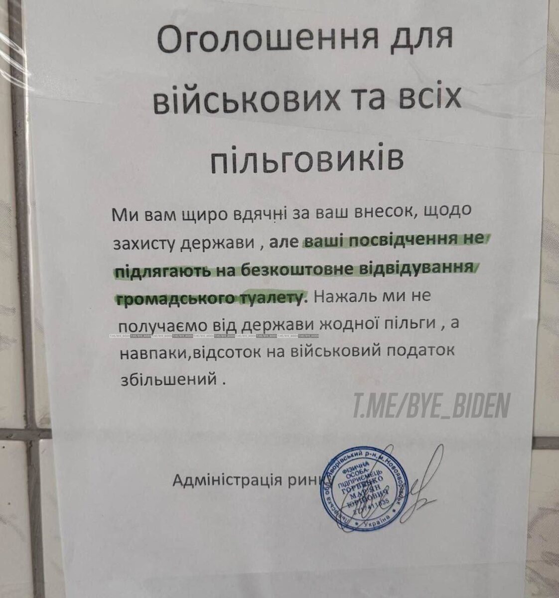 «Ваши удостоверения не дают права на бесплатное посещение общественного туалета. К сожалению, мы не получаем от государства никаких льгот, а наоборот, ставка военного налога увеличена», — гласит объявление на рынке Новояворовска.
