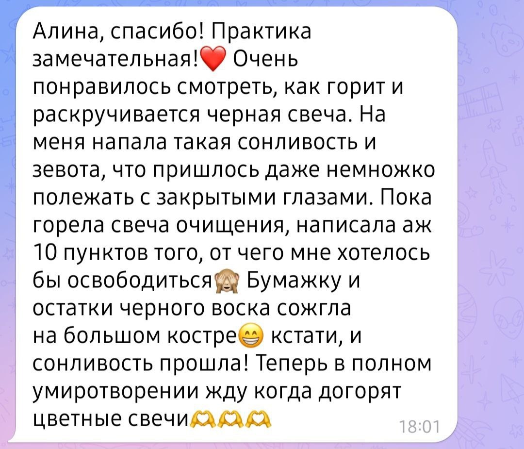 Вот такой шикарнейший отзыв только что получила от своей любименькой постоянной клиентки о наборе свечей и практике на День Летнего