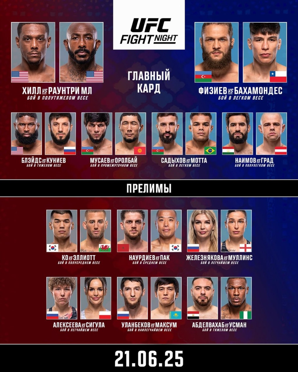 UFC Baku: Хилл vs Раунтри мл Турнир ЮФС Баку проходит сегодня в Азербайджане. Начало в 19 часов по московскому времени. Прелимы можно смотреть по платной подписке на UFC Fight Pass и Sportbox. Главный кард можно смотреть бесплатно на канале Матч ТВ - начало в 22 часа по московскому времени. Подпишись, чтобы не пропустить