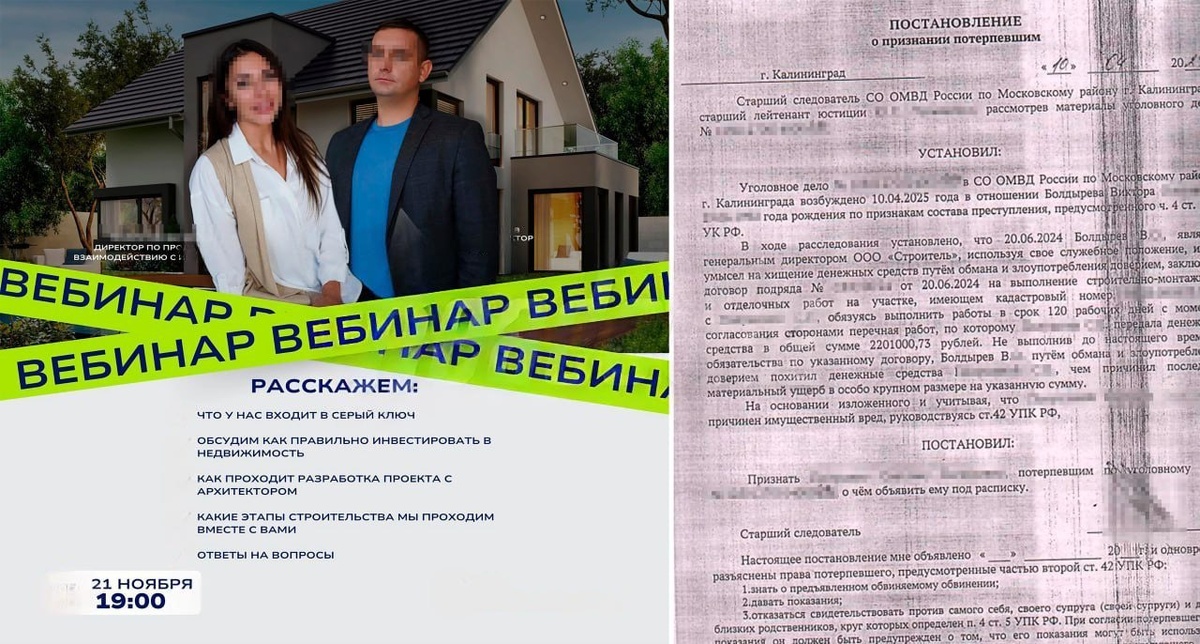 В Калининградской области 30 семей получили шиш с маслом вместо долгожданного жилья — их подрядчик, генеральный директор СК «Строитель» Виктор Болдырев, взял деньги и уехал «без обратного билета» в Таиланд. Как рассказала одна из пострадавших по имени Светлана, летом 2024 года она взяла деньги по госпрограмме и принесла их в контору — построить все обещали к декабрю. В октябре женщина решила наведаться на стройку и увидела только фундамент, затем работы и вовсе заморозили — к тому моменту Виктор уже был за пределами РФ.