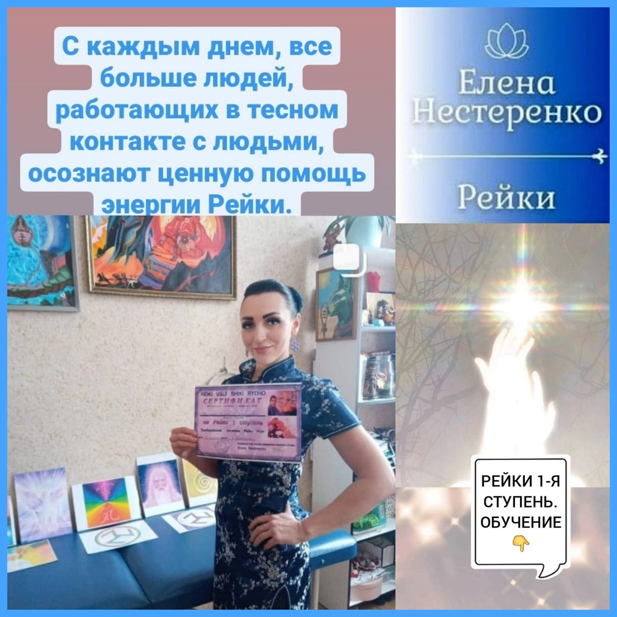 Рейки - древняя и очень эффективная система исцеления "наложением рук". Рейки-универсальная жизненная энергия. Понимание системы Рейки приходит через практику и опыт, которые индивидуальны. Сразу после инициации 1-й ступени Рейки у вас происходит: Кому может быть полезно обучение Рейки? Тем, кто: Ищет способ оздоровления для себя и своих близких. Ищет метод решения психоэмоциональных проблем. Кого постоянно мучают страхи, тревоги, хронические стрессы, депрессии. Кто в застое, кризисе, кто погряз в неудачах. Для тех, кто идёт путём личностного и духовного развития. Кто намерен усилить свой энергетический потенциал, изменить свою жизнь. Кто хочет выйти за рамки обыденности и собственных ограничений. Кому интересно узнавать новое и принимать позитивные перемены в свою жизнь. Тем, кто ищет практику для развития духа-энергия Рейки помогает продвигаться на этом пути. Практика Рейки будет весьма полезна всем тем, чья работа связана с общением с людьми, офисным работникам и руководителям, педа