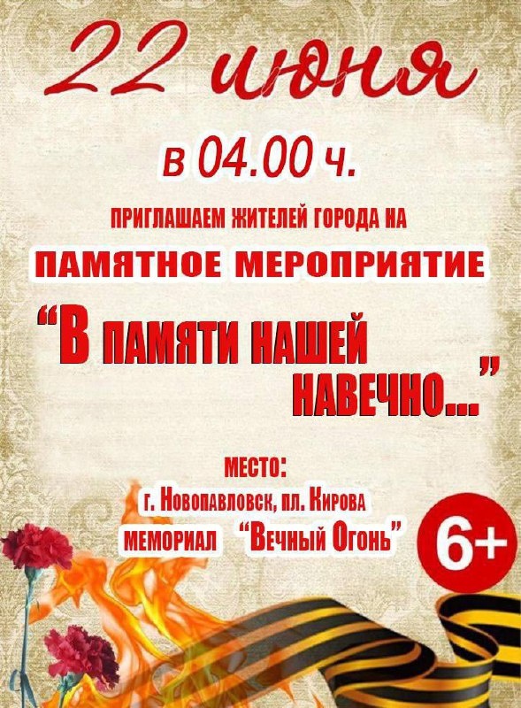 πΠ£Π²Π°ΠΆΠ°Π΅ΠΌΡΠ΅ ΠΆΠΈΡΠ΅Π»ΠΈ ΠΈ Π³ΠΎΡΡΠΈ Π³ΠΎΡΠΎΠ΄Π° ΠΠΎΠ²ΠΎΠΏΠ°Π²Π»ΠΎΠ²ΡΠΊΠ° 22 ΠΈΡΠ½Ρ ΠΏΡΠΈΠ³Π»Π°ΡΠ°Π΅ΠΌ Π²Π°Ρ Π½Π° ΠΌΠ΅ΡΠΎΠΏΡΠΈΡΡΠΈΠ΅ Β«Π ΠΏΠ°ΠΌΡΡΠΈ Π½Π°ΡΠ΅ΠΉ Π½Π°Π²Π΅ΡΠ½ΠΎ...Β» ΠΈ Π°ΠΊΡΠΈΡ Β«Π‘Π²Π΅ΡΠ° ΠΏΠ°ΠΌΡΡΠΈΒ», ΠΏΠΎΡΠ²ΡΡΠ΅Π½Π½ΡΠ΅ ΠΠ½Ρ ΠΏΠ°ΠΌΡΡΠΈ ΠΈ ΡΠΊΠΎΡΠ±ΠΈ. βΠΡΠ΅ΠΌΡ ΠΏΡΠΎΠ²Π΅Π΄Π΅Π½ΠΈΡ - 04.00 ΡΠ°ΡΠΎΠ². π₯ΠΠ΅ΡΡΠΎ ΠΏΡΠΎΠ²Π΅Π΄Π΅Π½ΠΈΡ - ΠΌΠ΅ΠΌΠΎΡΠΈΠ°Π» Β«ΠΠ΅ΡΠ½ΡΠΉ ΠΎΠ³ΠΎΠ½ΡΒ» π―οΈΠΡΠΈΠ³Π»Π°ΡΠ°Π΅ΠΌ Π²ΡΠ΅Ρ