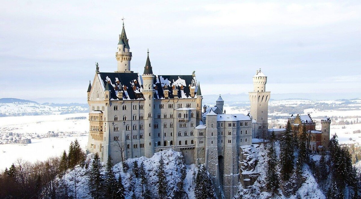 Замок Нойшванштайн в Баварии — один из самых сказочных и известных замков мира, построенный в XIX веке королём Людвигом II. Его строительство началось в 1869 году и продолжалось с перерывами до 1886-го, когда король трагически погиб, так и не увидев завершённым своё творение. Архитектура замка сочетает романские, готические и византийские элементы, создавая уникальный образ средневекового сказочного дворца. Нойшванштайн расположен на высоком утёсе среди живописных баварских Альп, с видом на озёра и густые леса, что придаёт ему особую атмосферу загадочности и волшебства. Этот замок стал прототипом знаменитого «Замка Спящей красавицы» из мультфильма Уолта Диснея 1959 года. Сам Уолт Дисней был настолько впечатлён Нойшванштайном, что сделал его эмблемой своей студии, и именно этот образ вдохновил создание замка в парижском Диснейленде. В мультфильме звучит музыка Чайковского из одноимённого балета, что ещё больше связывает сказочный мир Диснея с историей и атмосферой Нойшванштайна. Король