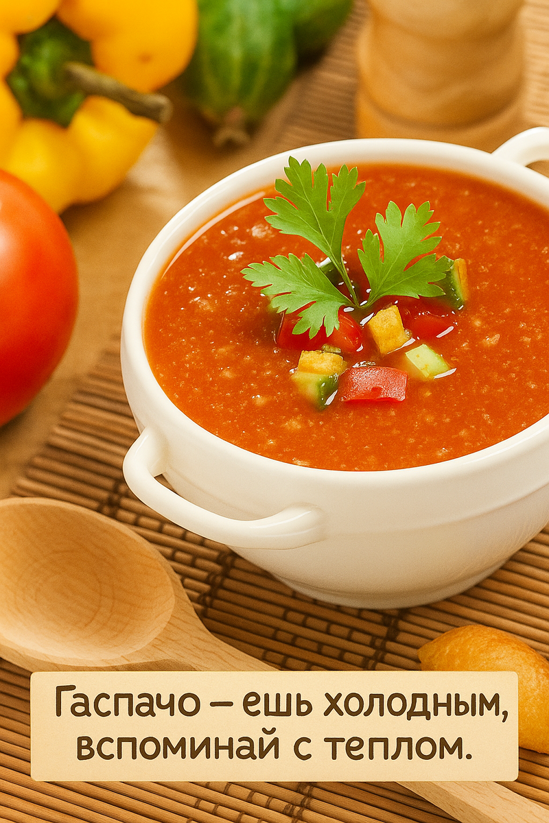 🍅 Гаспачо Классический (Андалузский) 🥒 Идеально для: Жарких дней, легкого ужина, полезного перекуса, впечатления гостей. 🍴 Ингредиенты (на 4 порции): Для подачи (очень важно!): 🔪 Приготовление: 🌟 Важные секреты успеха: 💡 Вариации: Наслаждайтесь освежающей классикой испанской кухни! ¡Buen provecho! 🍅🥒🫑🧊
