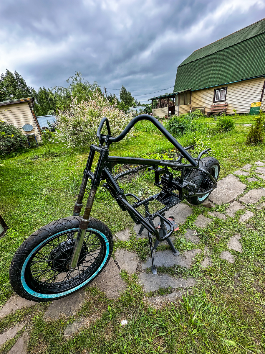 Приветствую вас на юбилейной, двадцатой статье моего проекта «На пути к мечте», и сегодня мы увидим, как каркас превращается в мотоцикл. Лето 2025 откровенно не балует нас погодой (сколько раз я это повторял за проект, напомните?). Исключением не стал и предпоследний выходной июня. Пасмурная атмосфера немножко начинает надоедать и давить, поэтому необходимо было добавить красок (из баллончика). И я психанул и закрасил всё, что можно черным. Под раздачу попала рама полностью, маятник, дуги, траверсы, верхняя часть перьев вилки. Нет, этот цвет и был задуман, и именно на этих деталях. Просто покраске могло предшествовать еще сколько-то этапов и попыток довести до совершенства, но вышло немного иначе. Я решил, что выкручивать (замените это слово на более подходящее) всю эту сварку, швы, неровности - можно до потери пульса, но так мы никогда не поедем, поэтому если можно покрасить - давайте красить. У вас мог возникнуть вопрос: а с местами отреза задних стоек как поступил? Поступил замечат
