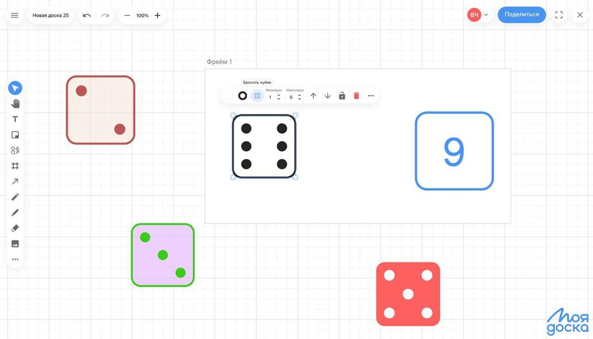 ⚡️Обновление — кубик для игр! Одна из частых просьб (которая меня вначале удивила) — добавить игральный кубик, реализована. Теперь мне уже понятно, что нередко на встречах, уроках и мероприятиях, которые проводятся на МоейДоске, хочется внести элемент игры или случайности (например, кто будет говорить / что-то делать следующий, а возможно даже организовать полноценную настольную игру). Кубику можно задать разные цвета, а также диапазон значений не только от 1 до 6, но и совершенно любой (1-10, 5-20 и так далее) и бросить его с красивой анимацией. Где найти: все специализированные инструменты доски, начиная с кубика, можно найти, кликнув на три точки на панели (дополнительные инструменты). Все для любимых пользователей, @moyadoska | moyadoska.com ❤️