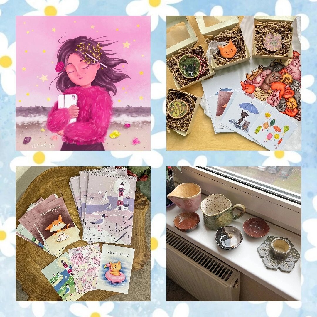 Питер творческий город, и как здорово, что творчество идет нога в ногу с сердцем полным любви🥰 Художник-иллюстратор Юлия Маджента | Иллюстратор , на ярмарке представит открытки, шопперы, блокноты и магниты с авторскими иллюстрациями. Но разве хужожника так просто останлвить на чем-то одном? Нет! В наличии также будет керамика ручной работы и спилы сосны с росписью. К этой ярмарке Юлия нарисовала несколько иллюстраций, на которые ее вдохновила морская тема 🌊 ...Ну, и конечно, котики) Команда для покорения сердец собрана! Море красивых изделий ждет вас уже ЗАВТРА! Ждем вас в гости❤