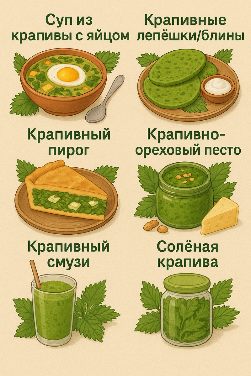Весенняя крапива — настоящий суперфуд: витамины С, К, А, железо, кальций, белок! Идеальна для супов, пирогов, соусов и чая. Вот 6 проверенных рецептов (от простого к сложному):