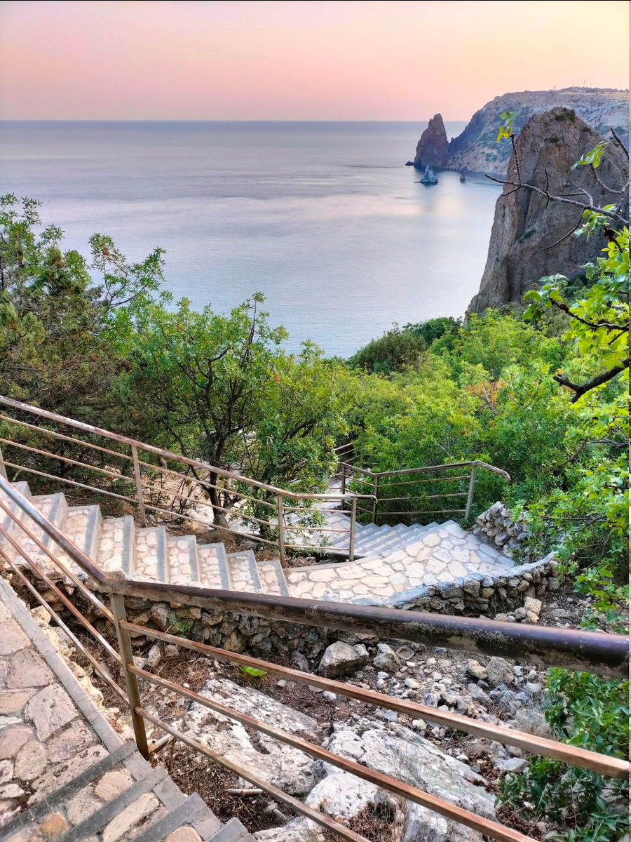 Знаменитый Яшмовый пляж находится у мыса Фиолент прямо под Свято-Георгиевским монастырем, который является достопримечательным местом и которое посещает много гостей полуострова. Я знаю эти места давно. Мы мальчишками излазили весь Фиолент. Ранее это был дикие пляжи, куда добирались малочисленные любители уединенного отдыха подальше от шумных и полных людей городских пляжей. Именно таким был и Яшмовый пляж. Это место, где располагается Свято-Георгиевский мужской монастырь обладает особой притягательностью и энергетикой. Если раньше спустившись к морю, можно было провести весь день и не встретить почти никого, то сейчас все изменилось. Стало ли лучше? Спорный вопрос... Окрестности монастыря облагородили и где раньше была голая степь, сейчас сделана территория с кафе, дорожками, беседками и скамеечками. Действительно, все хорошо и удобно. Знаменитая лестница в 800 ступенек ведет от монастыря к пляжу. Спуск по этим ступенькам довольно крутой и многим тяжело дается подъем наверх. Сейчас л
