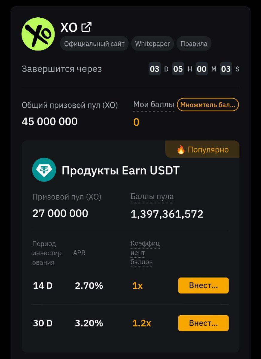 На криптовалютной бирже Bybit снова стартовала популярная промо-акция Megadrop, в рамках которой пользователи могут получить 45,000,000 токенов XO за участие в фиксированном стейкинге и выполнение простой ежедневной активности. Хотите узнать, как забрать свой airdrop XO — читайте дальше! Megadrop на платформе Bybit - это эксклюзивная программа раннего доступа к новым криптоактивам, которая позволяет пользователям зарабатывать свежие токены до листинга. Участвуя в акции, вы получаете специальные баллы, которые затем обмениваются на XO - при этом не нужно активно торговать. Всё, что потребуется — каждый день совершать хотя бы одну сделку на спотовом рынке и зафиксировать определённые средства в стейкинге на предложенных условиях. Что бы принять участие в акции и получить токены XO, необходимо следовать простым шагам: 1. Пройти регистрацию и KYC верификацию. 2. Иметь на балансе USDT или MNT. 3. После пополнения аккаунта, внести USDT и MNT в пулы стейкинга: 4. Продать токены XO. Megadr