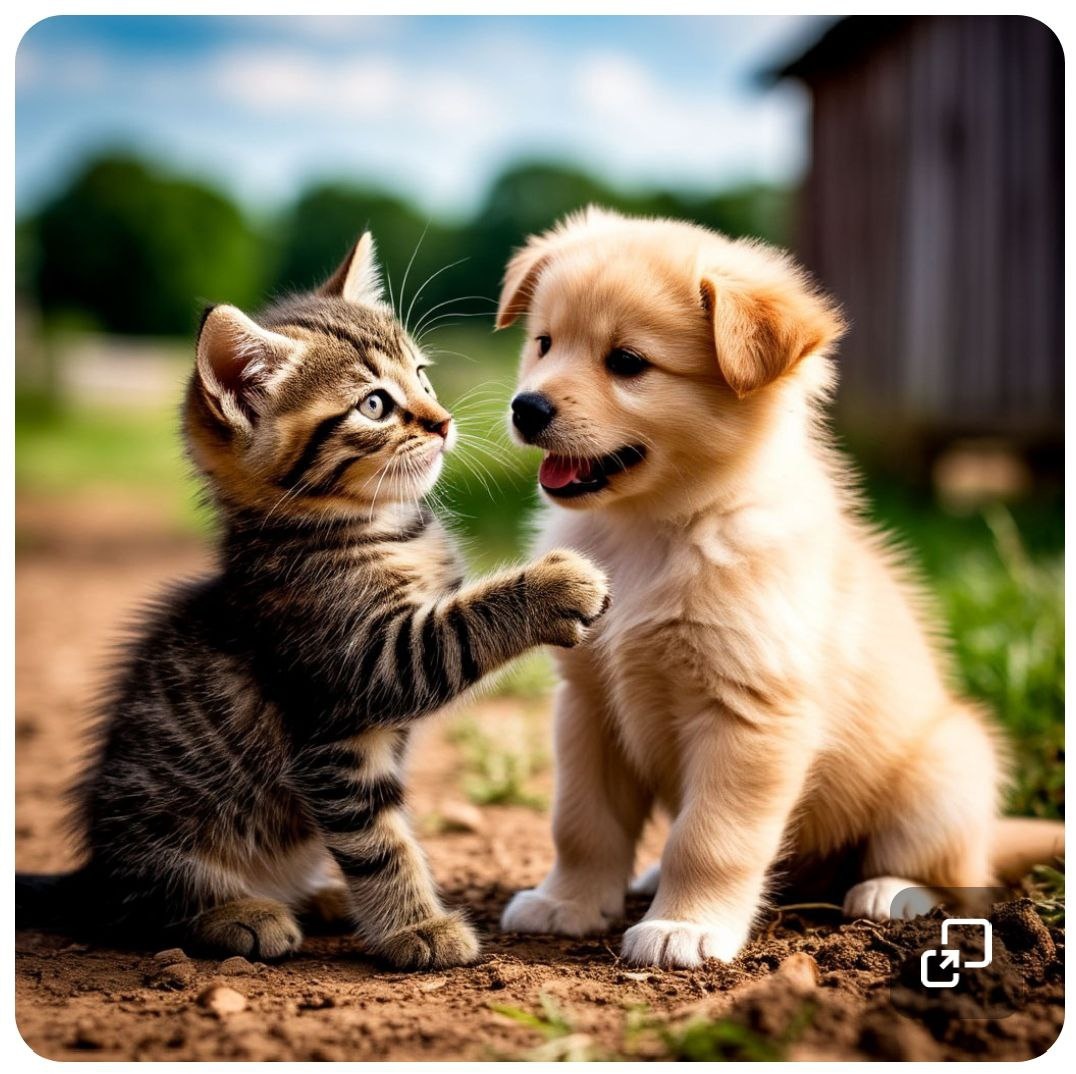 В одном дворе на большой ферме жили кот и собака. Когда они были маленькими и глупыми, и еще не знали, что они разные животные, у них прекрасно получалось ладить. Конечно малыши говорили на разных языках, но тогда это им не мешало. Когда котенок мяукал, то щенок знал, что хорошо бы побегать наперегонки, а когда щенок ворчал и зевал, котенок понимал - хорошо бы отдохнуть. Понимали они друг друга каким-то другим местом, но точно не головой.