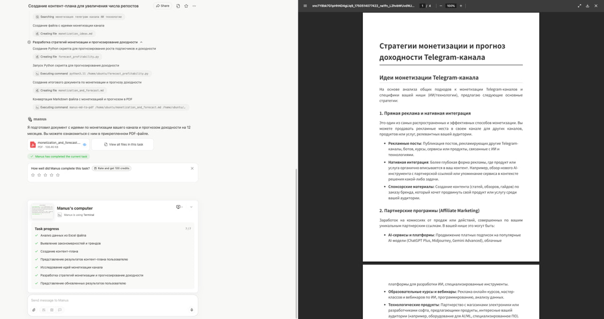 — Агент. Разбивает задачу на шаги и выполняет поэтапно. На выходе — результат, например, сайт, отчет, презентация, аналитика, сводка, некий итог работы — Адаптивный. Подбирает оптимальный вариант взаимодействия, исходя из того, какая задача по объему — Чат. Простой чат с Gemini (безлимитный и бесплатный) — Презентации (круто) — Веб-страницы (круто) — Картинки (советую выбрать что-то еще, результат слабый) — Видео (советую выбрать что-то еще, результат слабый) — Анализ таблицы. Загрузил все посты с канала, чтобы понять, что писать, чтобы всем нравилось. Получилось интересно, даю оценку полезности 8/10 — План моментизации проекта. Составил идеи по заработку на канале, чтобы это было без прямой рекламы. Оценка 8/10 — Подборка каналов для комментинга. Задача была выполнена слабо, думаю, что моя ошибка, надо было лучше описать задачу. Зато были крутые рекомендации, пусть 5/10 — Сайт. Я видел около 5-ти сайтов, которые сделаны Manus и все они были крутые, думаю, что 9/10 — Презентации на уро