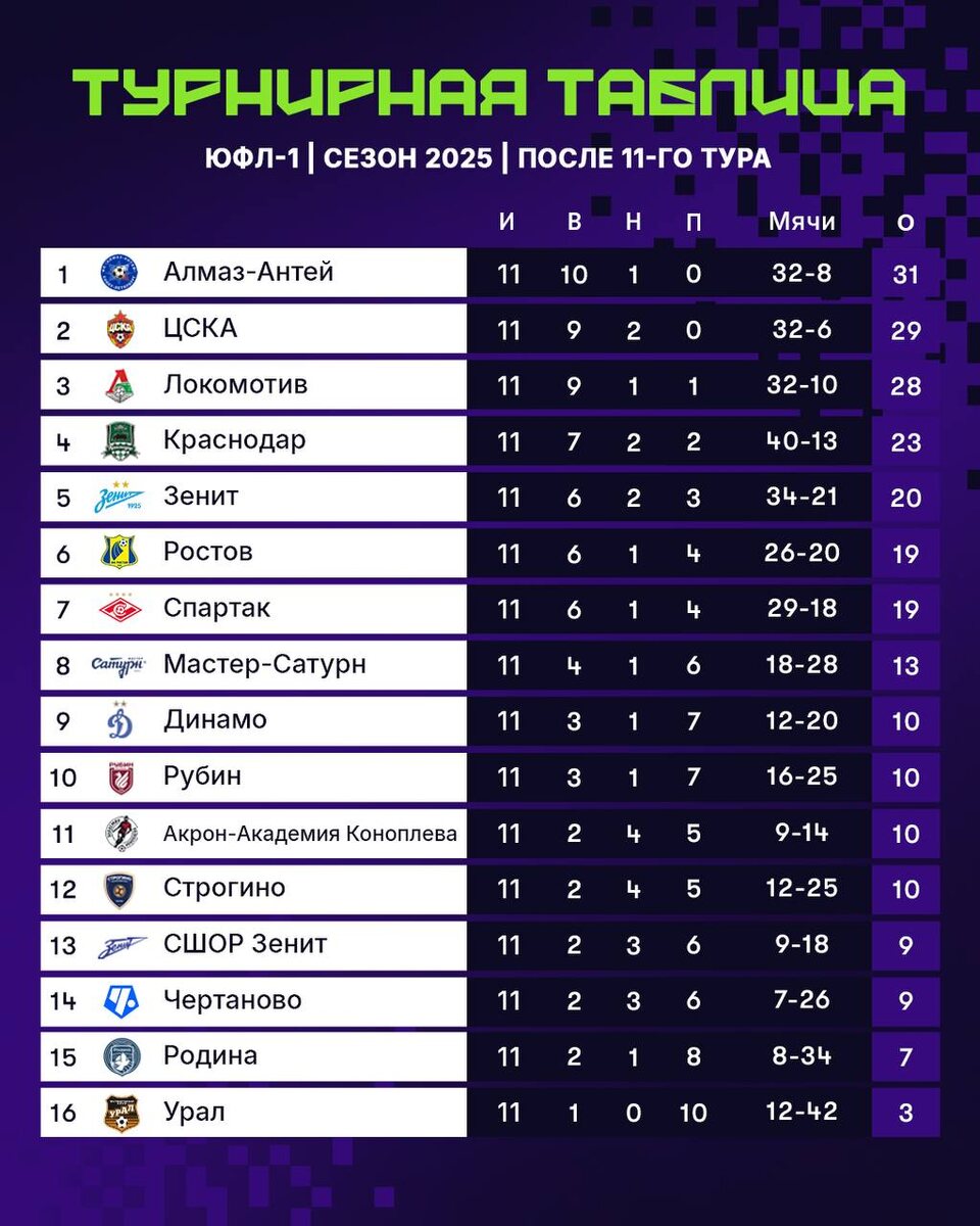 «Алмаз-Антей» – единоличный лидер ЮФЛ-1 после одиннадцатого тура! 🔥 «Спартак» продолжает возглавлять ЮФЛ-2 без единого поражения, а «Локо», имея запас очков, сохранил первую строчку в ЮФЛ-3 ☝🏻 Становится всё интереснее 🔜