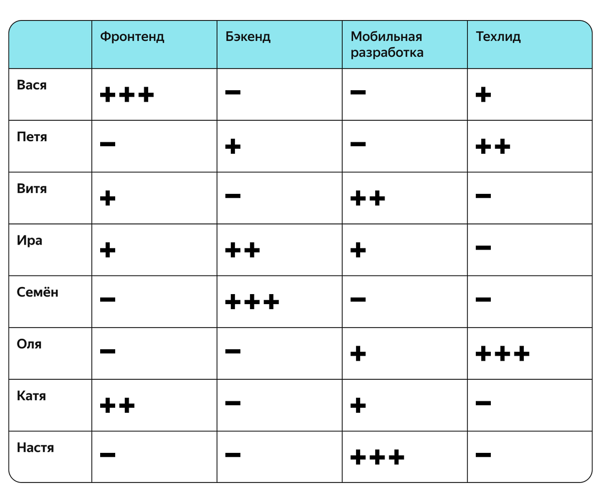 ✅ Помогает распределить задачи между участниками. В проектном менеджменте декомпозицию называют WBS (Work Breakdown Structure) или ИСР (Иерархическая структура работ). Если проект сложный, нужно выбрать специалистов с нужными навыками. Матрица компетенций помогает оценить, кто лучше справится с задачей. Вывод: Если в команде есть эксперт (например, senior-разработчик), он поможет разбить задачу и подскажет, кто что должен делать. Разделяем задачи по тому, кто их буде