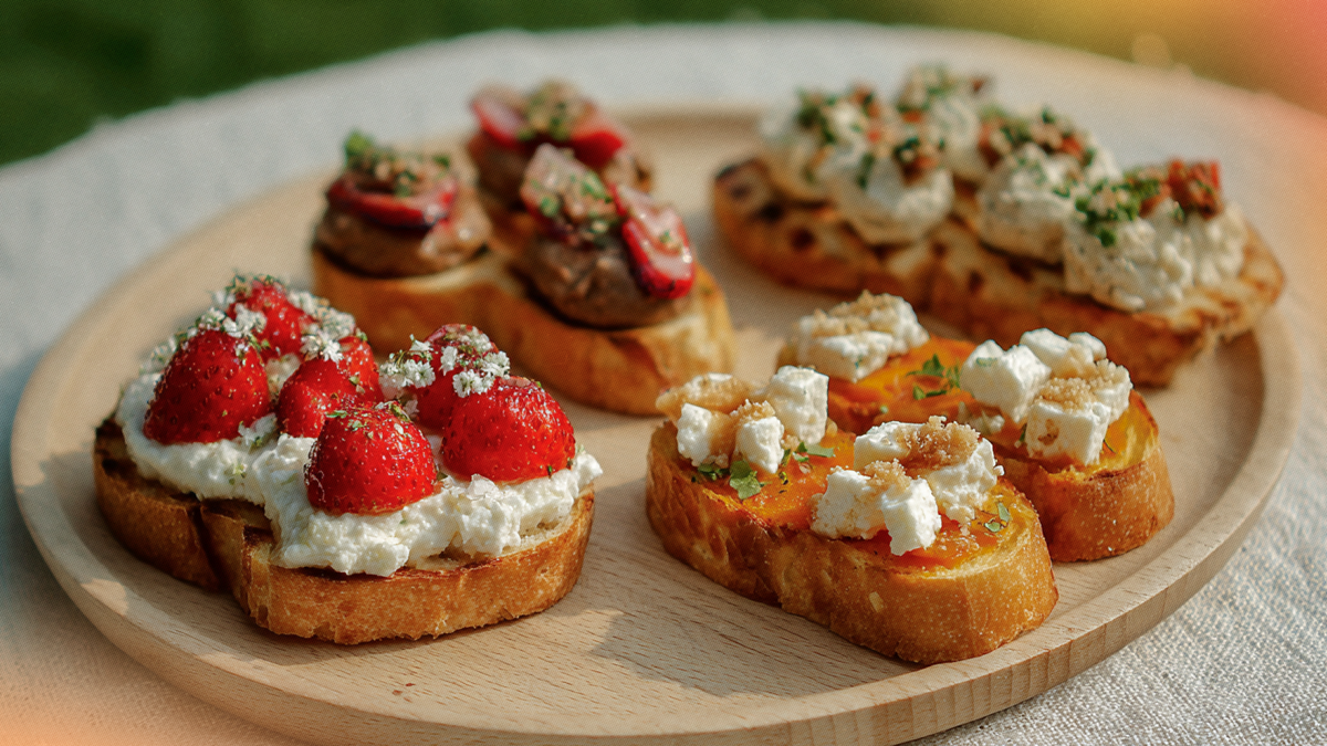 Брускетта с камамбером и клубникой: подсушиваем в тостере ломтики багета, выкладываем сверху треугольники сыра с белой плесенью, половинки ягод, посыпаем миндальными лепестками и по желанию поливаем медом.
