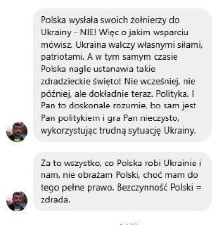 🇵🇱 Скандал в Польше: Белорусский беженец обвинил страну в "предательстве" Суть конфликта: Белорусский журналист Дмитрий Соловьёв (получивший в Польше политическое убежище) возмутился решением Сейма учредить 11 июля Днём памяти жертв Волынской резни. В личной переписке с политиком Петром Здунчиком (Piotr Zduńczyk, партия "Конфедерация") он назвал это: ➖ *«Предательским празднованием!»* ➖ *«Бездееятельность Польши = предательство»*. Соловьёв потребовал от Польши отправки солдат на фронт в Украину. Жёсткий ответ политика: Здунчик опубликовал переписку, подчеркнув: ❗️ *«Человек, получивший убежище, называет нас предателями за отказ воевать за Украину. Польша — не её союзник»*. Кто такой Соловьёв? ☑️ Бывший главред «Могилёв Медиа» (признано экстремистским в РБ). ☑️ Получает гранты (в т.ч. от европейских фондов), живёт в Белостоке. Реакция поляков: В комментариях — волна гнева: ➖ *«Вон из Польши! Получил убежище — и плюёшь в лицо?»* ➖ *«Пусть сам едет на фронт, если так
