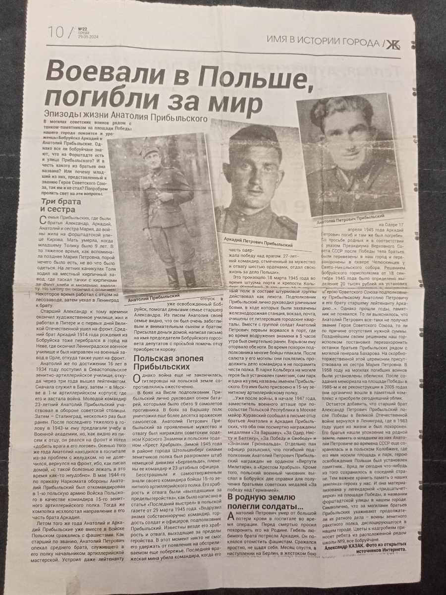 Остается добавить, что старший брат Александр Петрович Прибыльский после Победы в Великой Отечественной войне вернулся в Ленинград, где в 1983 году ушел из жизни и был похоронен. Его братья нашли упокоение на родной земле, память о младшем из них Анатолии Петровиче во времена СССР еще сохранялась и в польском Колобжеге, где его имя носили площадь и парк, герою освобождения Польши был установлен памятник… Вряд ли сегодня что-нибудь из того сохранилось в соседней стране. Тем важнее хранить память о наших земляках-героях у нас. И она материализована у легендарной «тридцатьчетверки» на площади Победы, в названии форштадтской улицы в нашем городе. Символично, что за могилами братьев Прибыльских ухаживают продолжатели их ратного дела – воины зенитного ракетного полка, дислоцирующегося в нашем городе. Цветы к надгробиям приносят ребята из расположенной рядом школы №9, все бобруйчане.