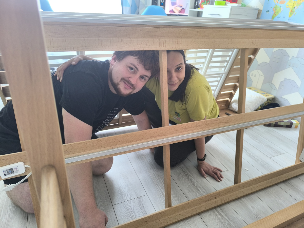 И вот вместо того чтобы тихонечко тащить мебель туда-сюда между дверными проёмами (хотя, конечно, далеко не всё в них влезет без разбора), нам (Ване) пришлось разбирать всё по-максимуму и крутиться с этими кусками по лестнице. Туда-сюда, диван отнесли. Туда-сюда, кровать спустили. Туда-сюда, пеленальную тумбочку подняли. Туда-сюда, детские столы опустили.
