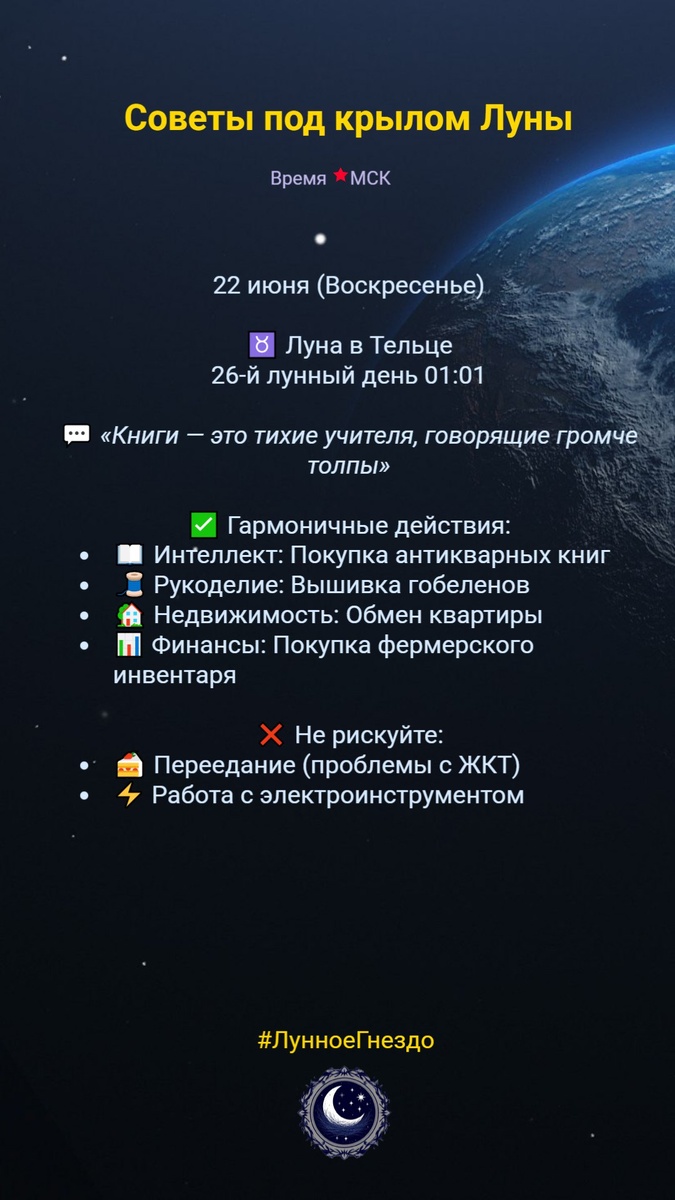 🚀 22.06.2025 — число дня: 1 «Энергия первого шага и новой главы» Сегодня Вселенная шепчет тебе: Ты — начало. Ты — движение. Ты — лидер своей жизни. Число 1 приносит в этот день: ✔️ Энергию старта и новых возможностей ✔️ Силу принять решение и пойти первым ✔️ Поддержку в самореализации и самовыражении ✔️ Ясность — ты сам кузнец своей реальности 💎 Что делать: ✅ Начинай то, что откладывал ✅ Веря в себя — ты притягиваешь удачу ✅ Бери ответственность за свою дорогу ⚠️ Осторожно: Избегай давления на других и излишней самоуверенности. Истина лидера — в ясности, не в контроле. 💫 Сегодня — твой день для смелых шагов. Готов ли ты стать инициатором перемен?