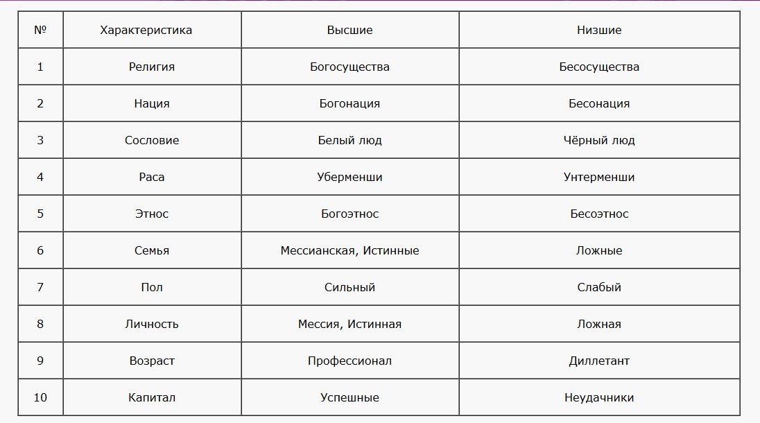 Поэтому должны определить одно слово, которым бы мы назвали представителей высшей и нисшей категории во всех 10 дифферинцациях. Вот таблица.
