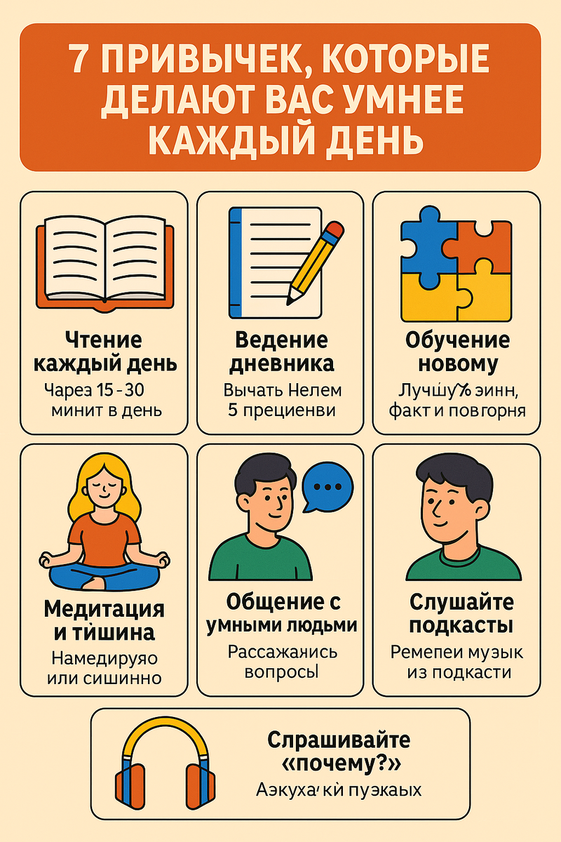 Хотите стать умнее без учебников и марафонов? Всё просто — начните внедрять полезные привычки в повседневную жизнь. Вот 7 научно обоснованных способов стать умнее уже сегодня: Читайте хотя бы 15–30 минут в день. Это может быть художественная литература, научпоп или статьи. Главное — расширяйте кругозор и словарный запас. Пишите ежедневно хотя бы 5 предложений: мысли, идеи, итоги дня. Это развивает критическое мышление и навык саморефлексии. Изучите одно новое слово, факт или навык каждый день. Маленькие шаги накапливаются и дают сильный эффект. Несколько минут тишины или медитации помогают мозгу отдохнуть и сосредоточиться. Это улучшает память и внимание. Обменивайтесь мнениями, спорьте, задавайте вопросы. Мозг обожает быть в интеллектуальной среде. Замените музыку в дороге на образовательные подкасты. Это один из самых удобных способов учиться на ходу. Привычка задавать вопросы ко всему — это топливо для интеллекта. Она тренирует любопытство и логическое мышление. Вывод: ум становится