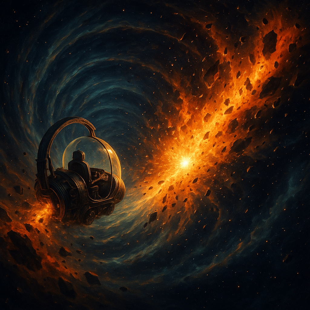 Вдруг он почувствовал, как его начинало клонить в сон. Главный герой не понимал, что происходит, как вдали появилась светящееся точка. Она начинала увеличиваться. На машину времени надвигалась шарообразная волна. Отсчёт времени начал замедляться. Искусственная звезда приближалась к путешественнику. Вскоре с другой стороны появилась такая же звезда, но при этом тех же размеров. Они были одинаковые не отличимые. Из этих звёзд начали исходить кометы, состоящие из неизвестного вещества. Через несколько секунд они приблизились друг другу, и они бы столкнулись, как вдруг между ними произошёл взрыв, и появилась стена. Сразу же после её появления время начало замедляться ещё больше. Кометы стали сбавлять свою скорость и в итоге остановились, также как и отсчёт времени.