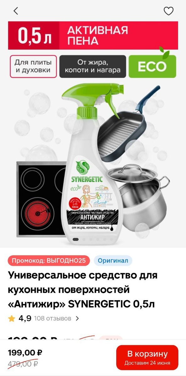 В Магнит Маркете мало того, что очень хорошие цены на Синергетик, так ещё и дополнительно скидка на чистящие средства разных брендов по промокоду ВЫГОДНО25. Итого 2 флакона мне обошлись в 300 руб. Не зевайте😉 А Синергетик антижир в спрее я использую для сковородок, кастрюль и даже духовки