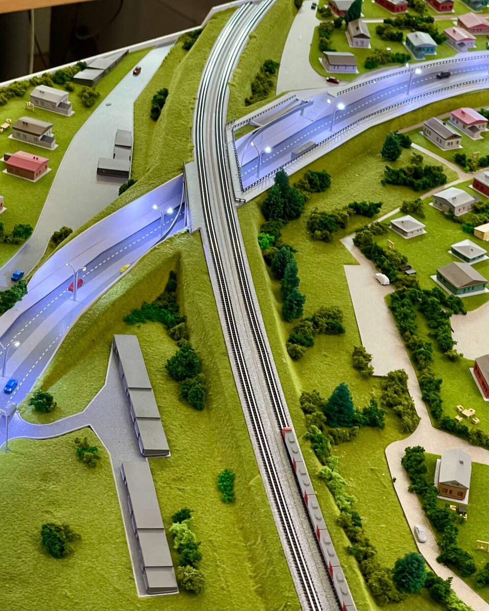 Второй макет в масштабе 1/500 - также для стенда Кировской области - строящийся путепровод в одном из районов города. Главный объект - это дорога и мост, но нам, конечно, пришлось подробно показать всю территорию, попавшую в зону макета) Кажется, получилось очень живописно 😉