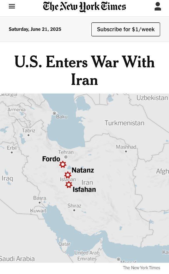 🇺🇸🇮🇷 Заголовок в одной из статей New York Times: Америка вступила в войну с Ираном.